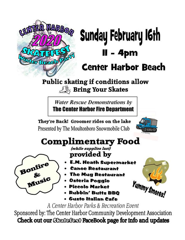 Guests are encouraged to bring their own ice skates however there is much more to this Skatefest than just ice skating! The center Harbor Fire Department will be present demonstrating water rescues and educating techniques on self-rescues. The Moultonboro Snowmobile Club will also be present showcasing their groomers and even offering rides along the lake in them! Attendees will have the chance to see the M/S Mount Washington docked at the Center Harbor port located directly next to all the event happenings. Guests will be able to enjoy music playing throughout the event and warm up next to next to the large bonfire and enjoy delicious s’mores. However don’t fill up on just s’mores, there will be complimentary food provided by Canoe Restaurant, E.M. Heath Supermarket, The Mug Restaurant, Osteria Poggio, Piccolo Market, Rubbin’ Butts BBQ and Gusto Italian Café.