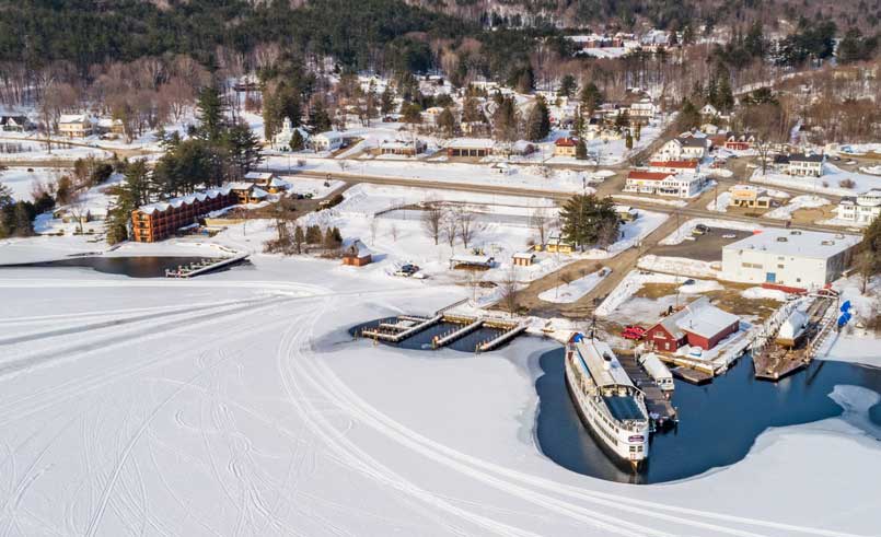 Ice out on Lake Winnipesaukee was officially declared on Friday, April 8, 2022 at 5:20pm. Each year locals and vacationers await the announcement of Ice Out, an event which signifies the point in which the M/S Mount Washington cruise ship is able to navigate to all five ports along the Big Lake located in Weirs Beach, Wolfeboro, Meredith, Alton Bay and of course, right next dock to us in Center Harbor. Pilot Dave Emerson takes multiple flights over the lake around the period of ice out to get a bird’s eye view of the phenomenon to help make the official announcement. This a tradition that has been in Dave’s Family for over forty years now, but Ice Out has been monitored long before then, dating back to 1887 for the first ever Lake Winnipesaukee Ice Out announcement which was decided from shore.