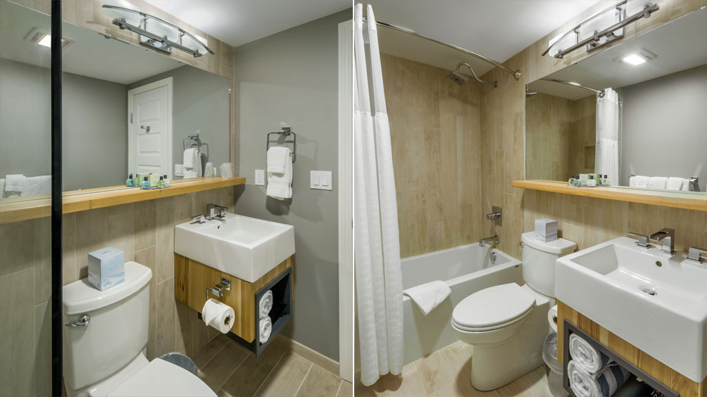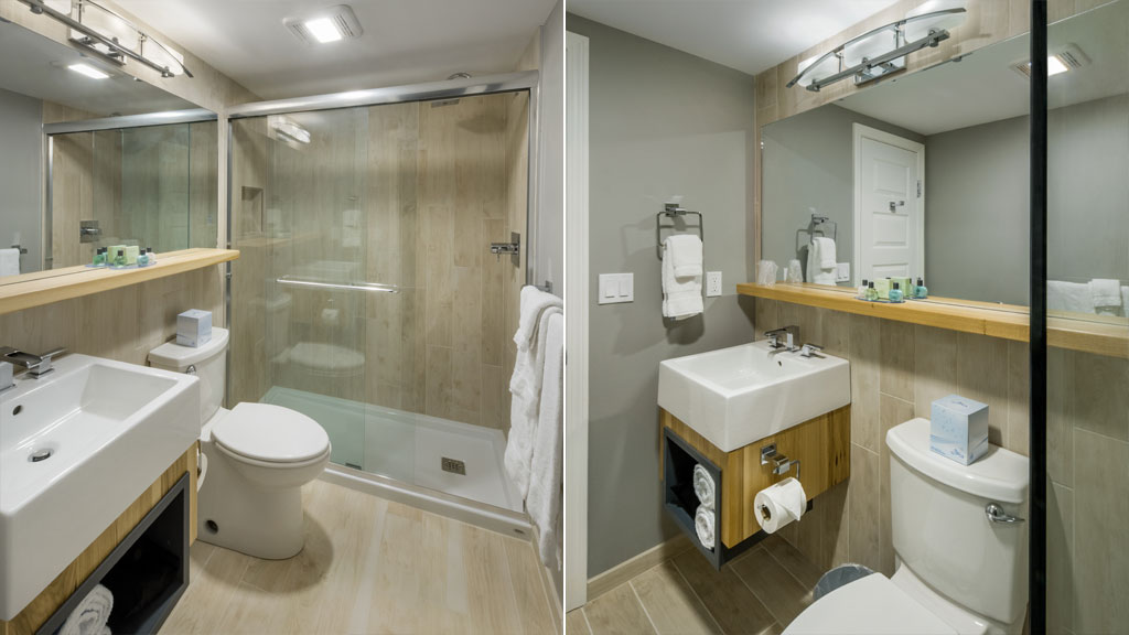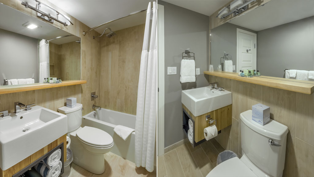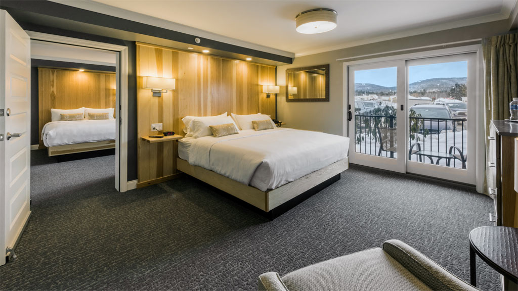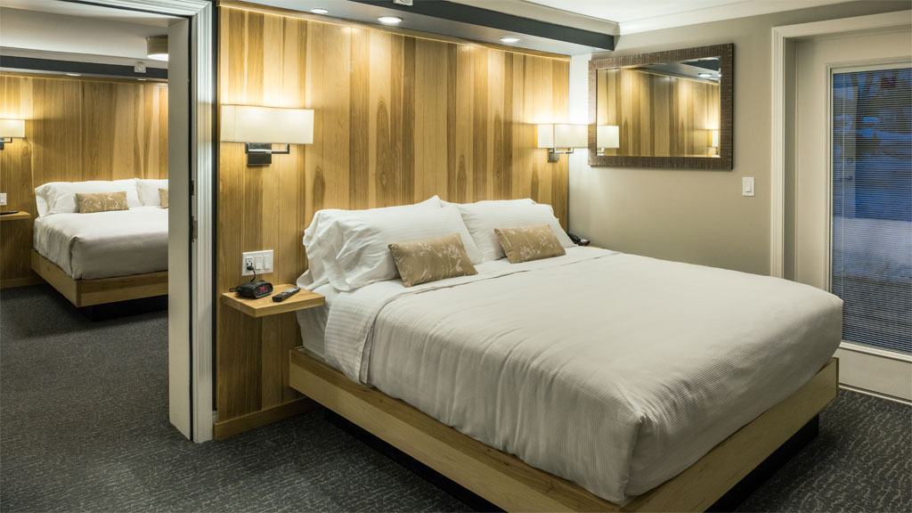 Enjoy extra sleeping capacity for your friends or family in this combination unit that ties together our Lodge King and Lodge Double Queen hotel rooms through a convenient communicating door. Enjoy the lakeside setting from your private balconies and fold back the privacy screen to take full advantage of the outdoor space. Accented with modern design and rustic elements, this combination unit offers one room with a king size bed and an adjoining room with two queens. Each room includes a large format, flat-screen TV, a mini-fridge, a microwave, a coffee maker and a modern fully tiled bathroom incorporating a contemporary shower in the king portion and a bathtub in the queen portion.