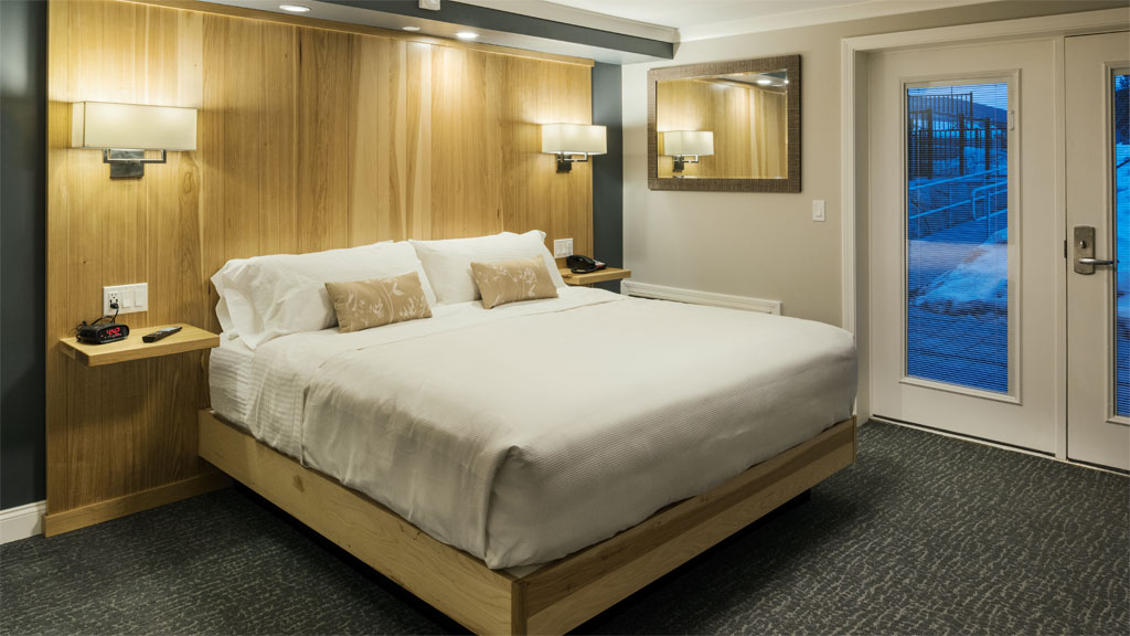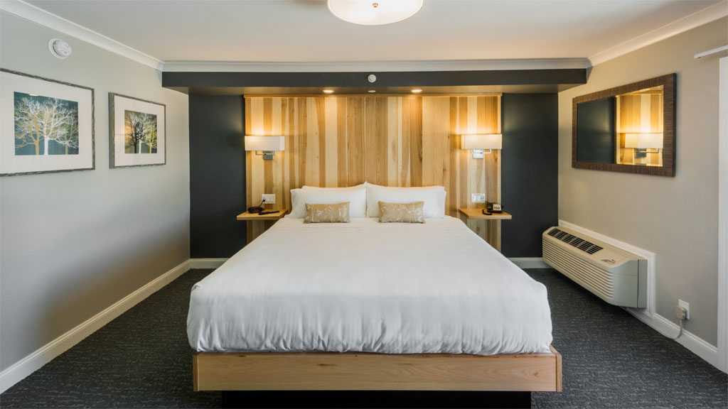 Get close to the action with these unique rooms just steps from our sandy stretch of beach. Experience direct access to our 4-season, outdoor hot tub and lakeside beach facilities. The Beach Level King Rooms offer the perfect blend of modern design, rustic features and unparalleled access to Lake Winnipesaukee. Relax in your king size bed or spend the day lounging on the beach with the comfort of your room just a few feet away. Room amenities include a large format, flat-screen TV, a mini-fridge, a microwave, a coffee maker and a modern fully tiled bathroom incorporating either a contemporary shower or bathtub.