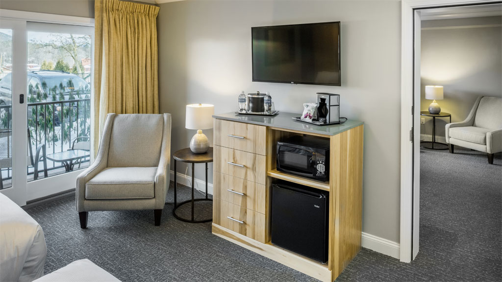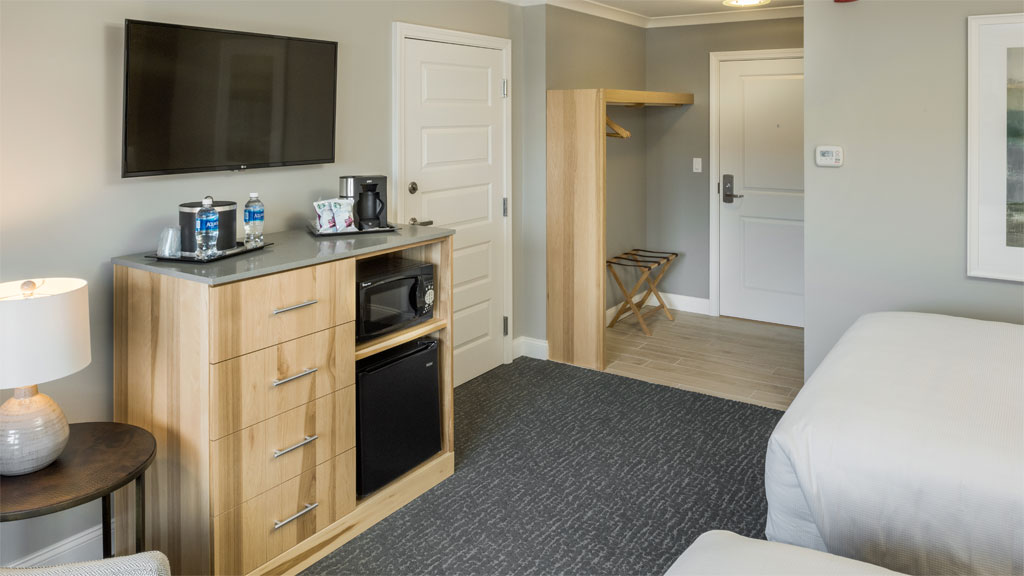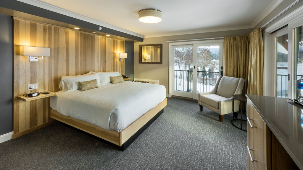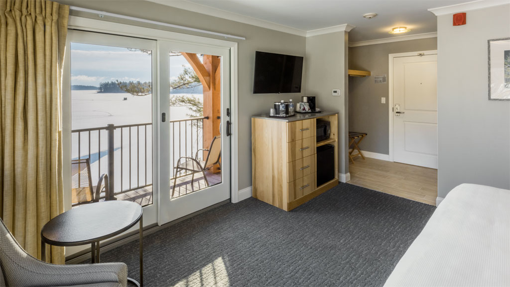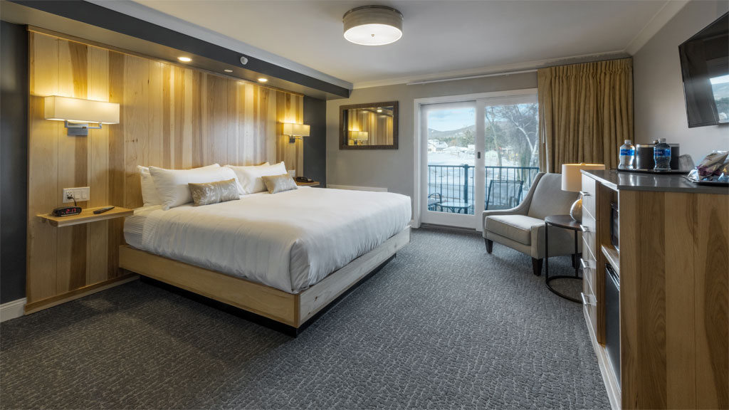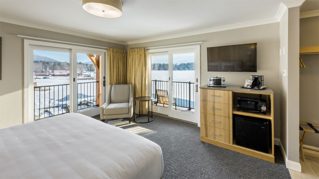 Enjoy the lakeside setting on your private balcony. The Lodge King Rooms offer the perfect blend of modern design and rustic tones for your next Winnipesaukee getaway. Relax in your welcoming king size bed with its signature floor to ceiling hickory headboard or spend an evening enjoying the views and fresh lake air from your deck. Room amenities include a large format, flat-screen TV, a mini-fridge, a microwave, a coffee maker and a modern fully tiled bathroom with glass paneled showers and custom hickory vanities.