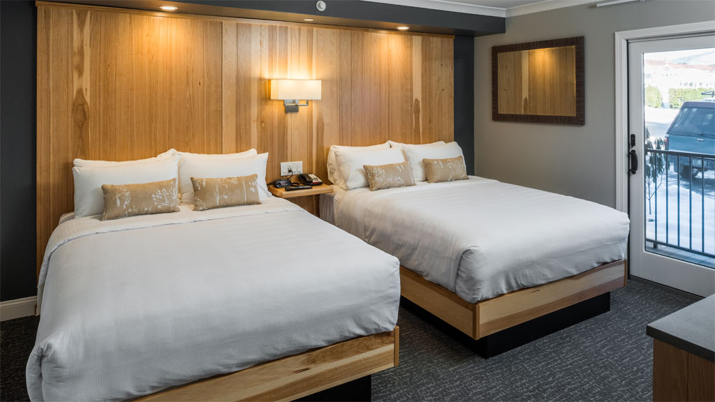 With sleeping for up to 4 guests, experience an authentic lake side getaway with your friends or family. The Lodge Double Queen Rooms offer the perfect blend of modern design and rustic tones for your next Winnipesaukee getaway. Enjoy the extra sleeping capacity of two queen beds set against a beautiful floor to ceiling, accent headboard. Room amenities include a relaxing balcony, large format, flat-screen TV, a mini-fridge, a microwave, a coffee maker and a modern fully tiled bathroom incorporating a custom hickory vanity and a bathtub. Ask about renting the adjoining Lodge King Room for extra sleeping capacity.
