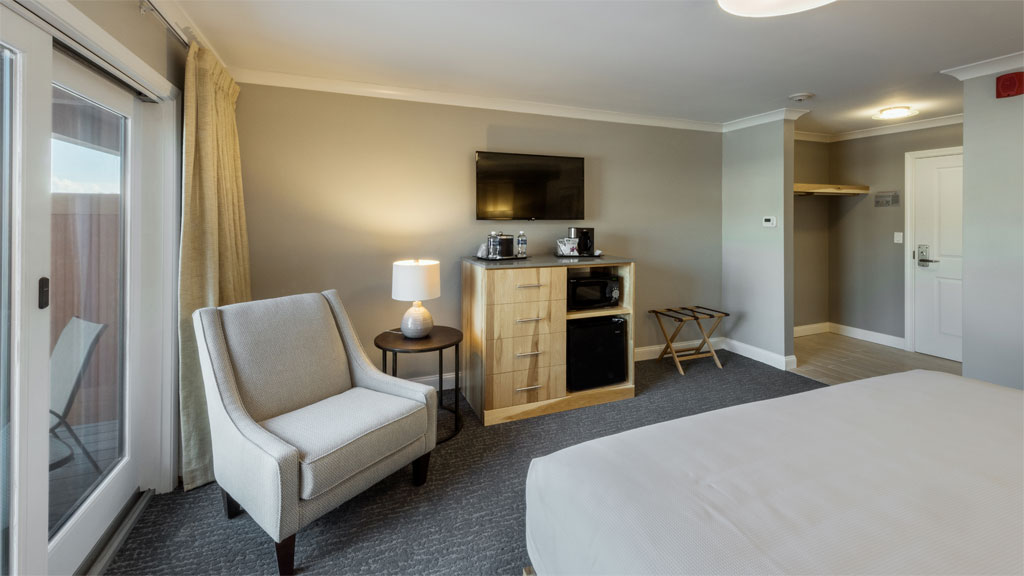 Enjoy plenty of creature comforts in this spacious suite, located on the first level of the detached vacation cottage. The Cottage King Suite offers one of the largest rooms available on the property with recently updated living space and a fully renovated bedroom and bathroom. This unit is one of the best values available at the Inn. Suite amenities include a King size bed in the master bedroom and a queen pullout sofa in the living space. Enjoy ample legroom with a large living room, an attached dining room and a full kitchen. Room amenities include a stove, microwave, full size refrigerator, coffee maker, large flat-screen TV and dining area.