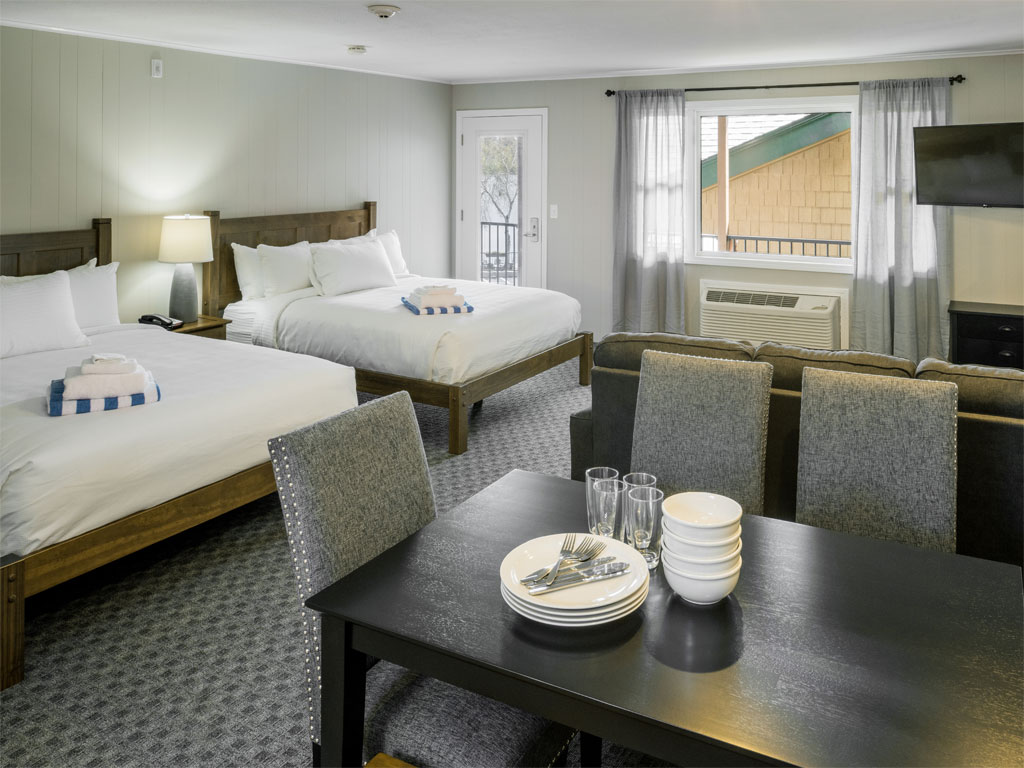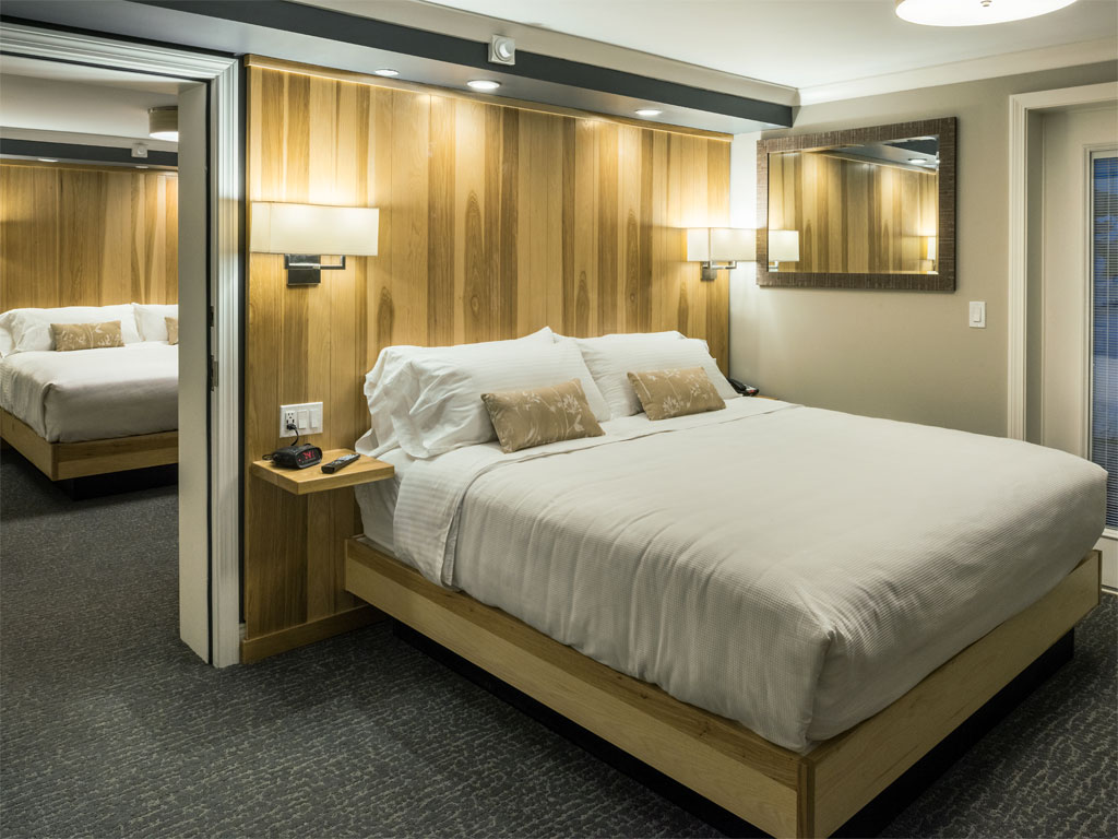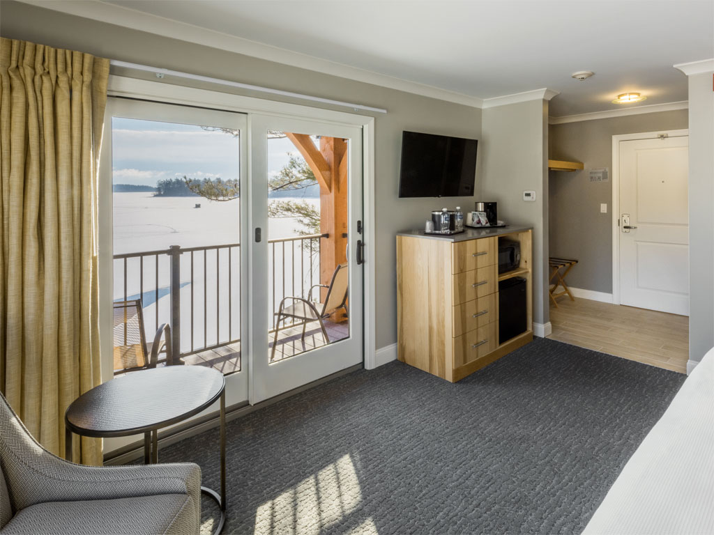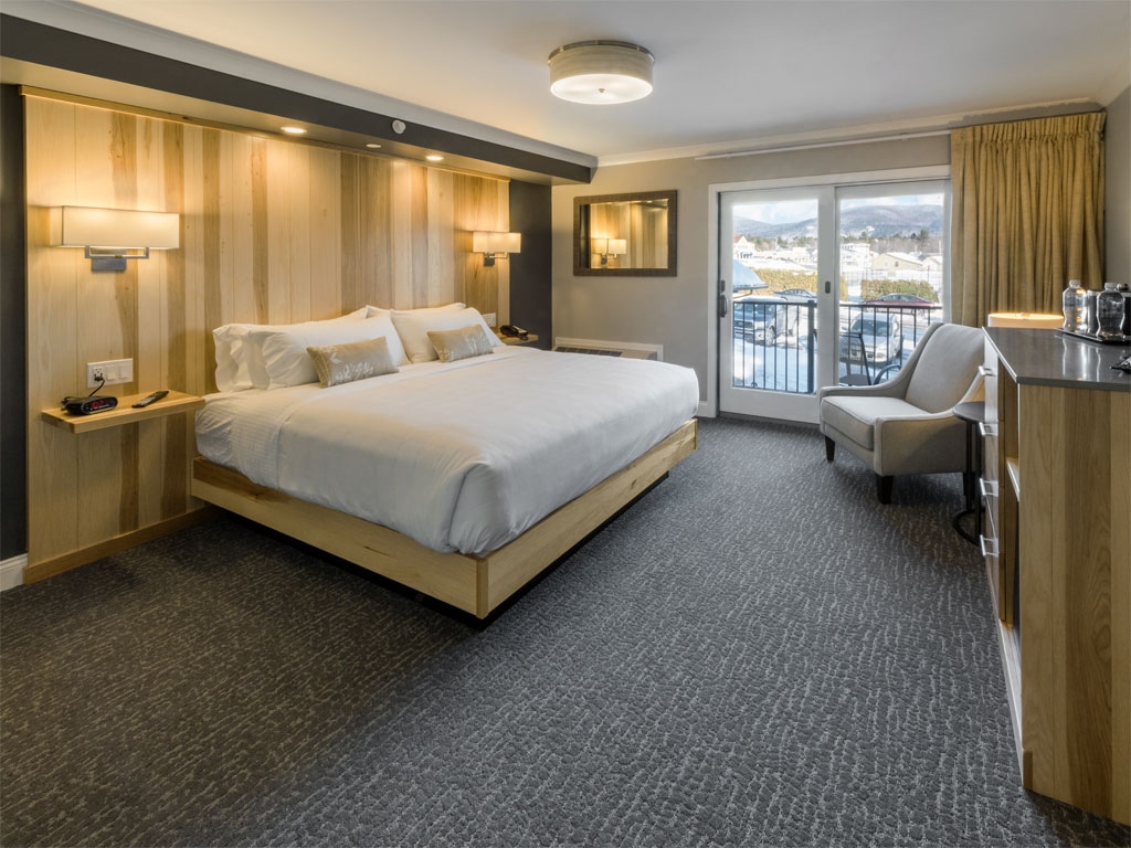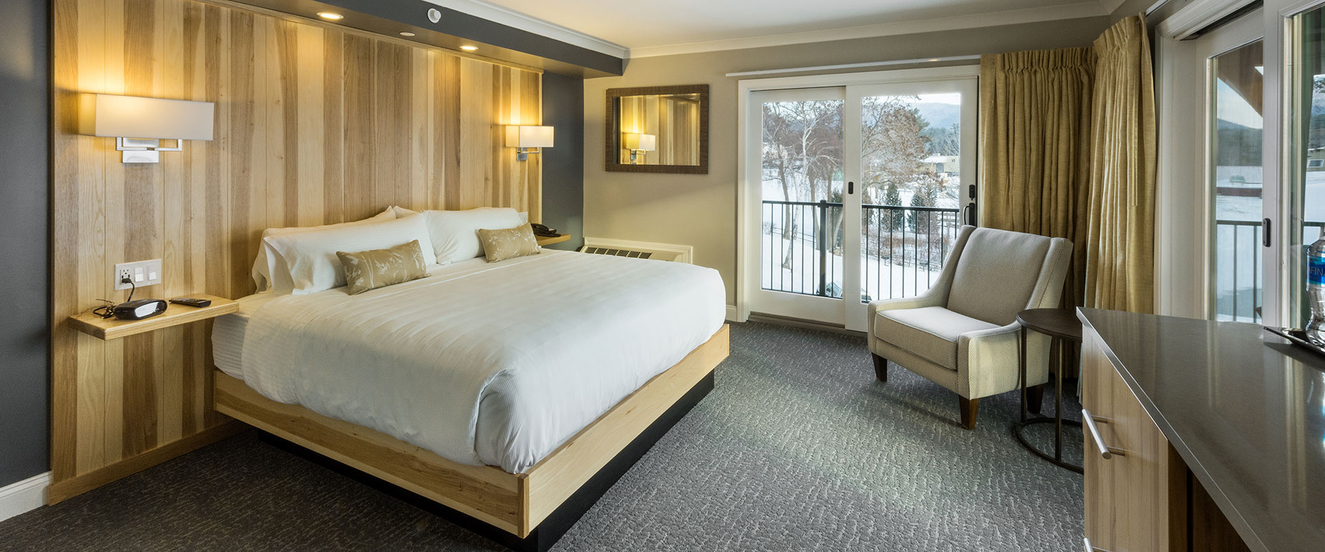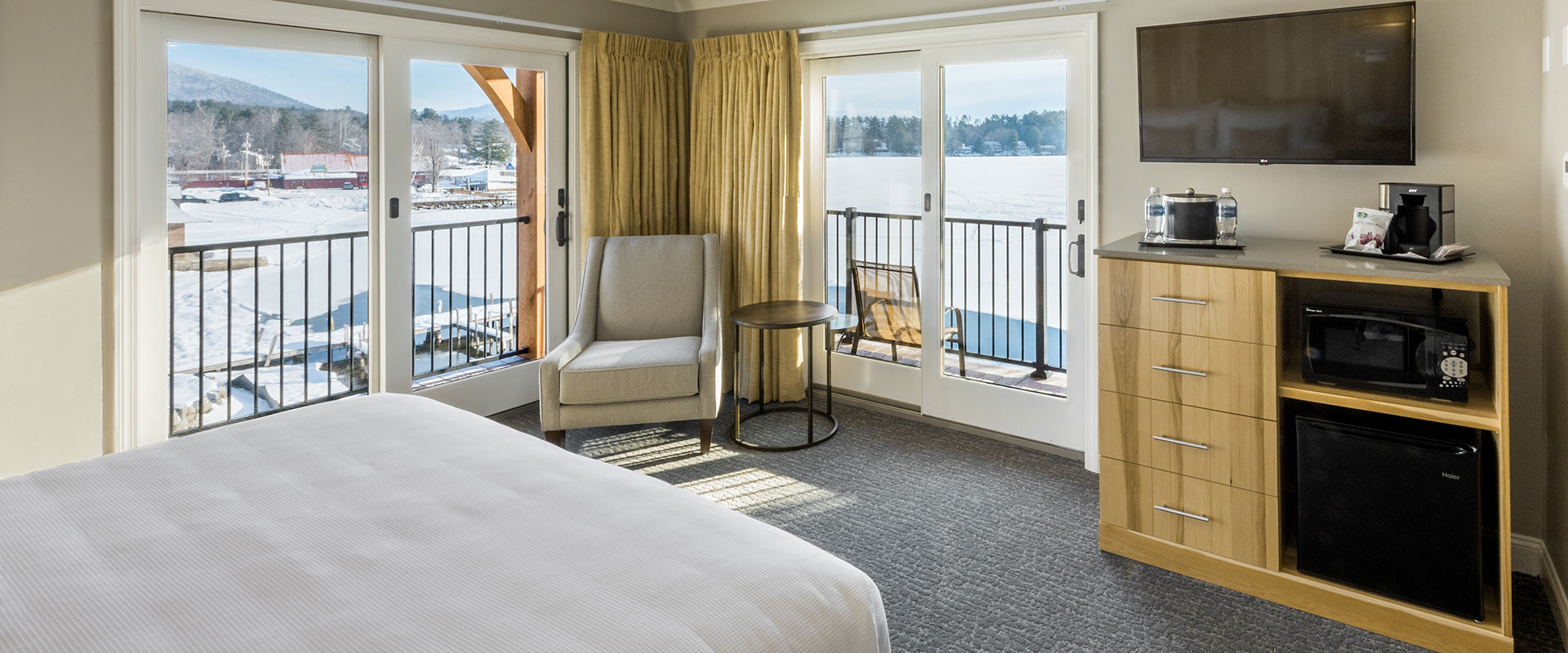 Within a half-hour drive of the mountain, our accommodations offer the perfect balance of access to skiing excellence and lakeside charm. Experience waterfront living with rooms featuring rustic wood tones coupled with modern design and balconies overlooking Lake Winnipesaukee.