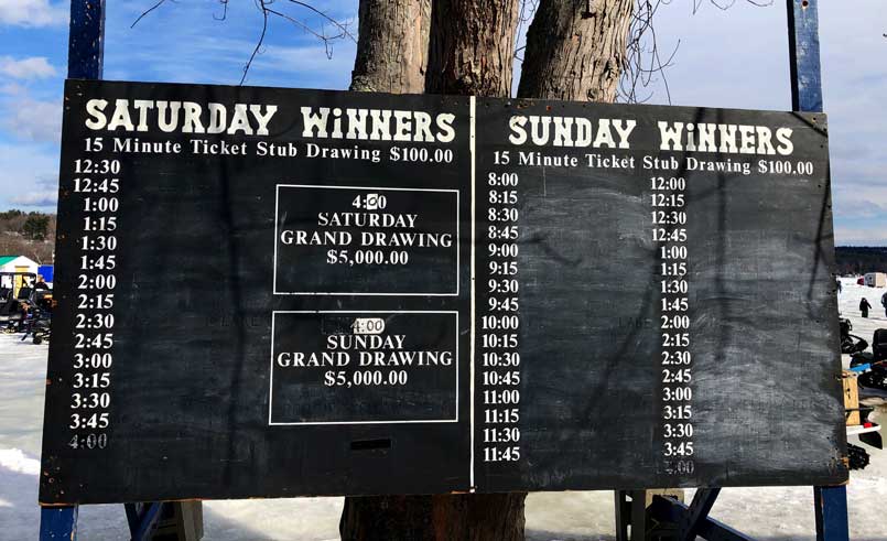 Derby weekend is an exciting time for fishermen and women from all over to attempt to catch the largest, award-winning fish, pulling it up from under the several inches of ice covering the freshwater bodies in the state. There are seven species of fish that can qualify for the winner’s board: Black Crappie, Cusk, Lake Trout, Pickerel, Rainbow Trout, White Perch and Yellow Perch. The largest fish of each category is qualified to win the three top prizes which include cash winnings of $3,000, $5,000 and the grand prize of $15,000! There are more ways to win prizes throughout the weekend (even if you are not fishing in the derby) with 46 derby ticket stub drawings for $100 each and a $5,000 drawing on Saturday and Sunday!